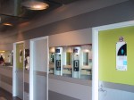 PRESIDENT PLAZA is an Asian office/shopping center @ Cambie Street, Richmond Shopping District, which has been opened for almost a decade. The area of the alteration was the existing north entry that had been accommodating a much higher traffic than expected. Striving to provide a very dynamic design to the rather banal north entry, the two flanking walls were clad with different alum laminates with different texture and reflectivity, forming bands running horizontally to create a sense of movement. The choice of metallic laminate also had to do with the existing metal cladding on the building exterior, its durability and flame rating. Mirrors were installed at the eye level section thru out for reflections and add visual connection across the entry. A multiple-sections canopy, each tilted at a slightly different angle and faced with a dark mirror finish laminate, was hung from the original ceiling. Oval opening were strategically cut out on the canopy to allow existing lights to filter thru. A smaller trapezoidal shaped “fly” canopy, clad in red gloss plastic laminate, was placed at a lower height, over the existing telephone area with punch opening directly above each telephone booth. Small halogen task lights were added in between.