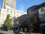 A 4 STOREY 25,000 SQ FT MIXED USE COMMERCIAL BLDG in downtown Vancouver. The existing building was previously used for a single tenant retail building. The alteration was changing it to a mixed use commercial w/ retail on ground floor, 2nd floor and basement, while the 3rd and 4th floor was changed to multiple tenants office use. A public corridor with an elevator lobby was added on the ground floor for access to the office area. Fire rated wall, smoke detector, sprinkler system and exits, etc were upgraded to meet the new building code. The exterior metal wall cladding and marquee was painted with new architectural grade paint and fitted with a new stained wood soffit, while the existing storefront was faced with new large format European tiles. A recessed vestibule with intercom system and a fire annunciation panel was added for the office entry as part of the upgrade.