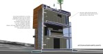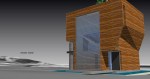 “Prism house is a dwelling for a small family of four, with sustainable features. A small footprint of approx. 30ftx 30ft is intended for that reason. The four facades each have a distinct character. The south entry facade has a 15ft x 30ft louver, which is adjustable and monitored by computer to response to the sun intensity, angles, to allow for optimum amount of natural light, heat penetration. The louver is adhered with photovoltaic films that generate electricity. Behind it is energy efficient windows with operable sections for cross ventilation. The north side is rather transparent to allow view. Full height windows off the living space with guard rail outside can be wide opened. Privacy provided by interior screens. The west elevation accommodates three water tanks, which stores the “filtered” water runoff from the green roof, re-filtered and pumped back for irrigation and to the pond, and also provide grey water for toilet use. The east side, which faces the “lagoon” has a more amorphous or sculptural projection. The house is supported on stiles over a pond, to minimize fill and intended for better earthquake performance. There will be a green roof on top. The lower level will be a multipurpose room/home office. No garage is designed-intended for more bicycle/public transit use or car rental when necessary…”