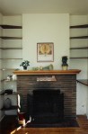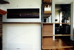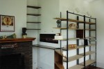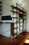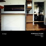 The studio has a 15′ wide x 14′ length ‘L’ shape configuration. The space is flooded with natural lights from the windows on two walls during the day. All the walls and ceiling were painted white color to provide truer color rendition. The workstation top was made out of “off the shelf” hardboard door and the cabinets and shelves were made out of unpainted MDF board and mill finish steel angles that lends an industrial and unfinished quality, which contrast with the domestic character of the setting. A pivotal “nose” of the bookshelf adds to the temporal quality of the space.
