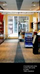 CHOCOLATE BANK was a new 500 sq. ft store specialized in Belgium and Swiss import chocolate, located near the main stairway entry of Crystal Shopping Mall. The store had a trapezoidal shaped plan with a column behind one of the display window. The left wall had a bank of windows that allows ample natural light, while the back wall was almost fully glazed all across. Because of its strategic location near the main stair entry with the roof patio beyond, the store unique proportion and plenty of natural lighting, our concept was to design a ”passage” shopping area with an outdoor feeling that seems as a continuation of the main stair entry. On one side was a wall of display glass shelves with a “theater” backdrop laminated with painter palette pattern, and an angled overhang above for added spotlighting. A counter aligning with the different geometries of the store was located at the back. A “chocolate slab” wall/column/display was used to disguise the column behing the display window. An European stone look porcelain tiles was used for the flooring, with a triangular strip paved with dark slate broken to irregular pieces, and embedded with tiny golden mosaic. A little bistro style table and chairs were placed at the back corner.