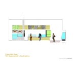 MATERIAL: selection of finish and materials were based heavily on easy maintenance, durability and cost effective. While the majority of the wall assembly was made up of site erected non-combustible steel stud drywall for ease of running pipes and service inside, etc. and minimal clearance requirement from exhaust hood and ducts, the bulkhead was made of shop fabricated combustible plywood millwork for better quality control in shop and minimized dust and sanding on site. The millwork was mostly clad in bamboo faced plastic laminate with a stainless steel countertop for durability and ease of maintenance.